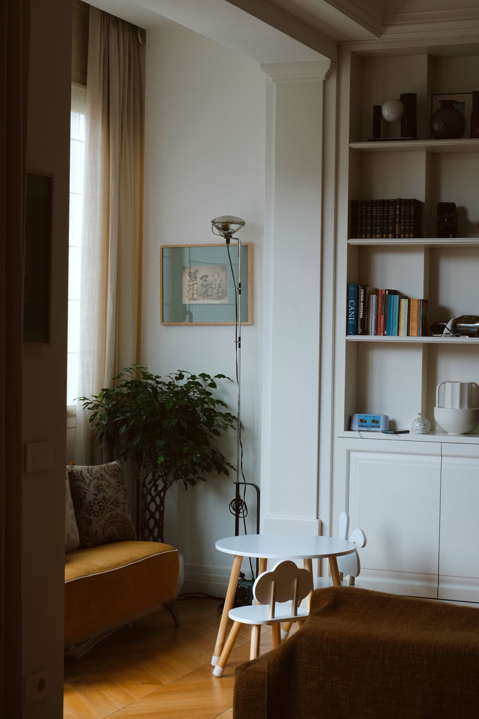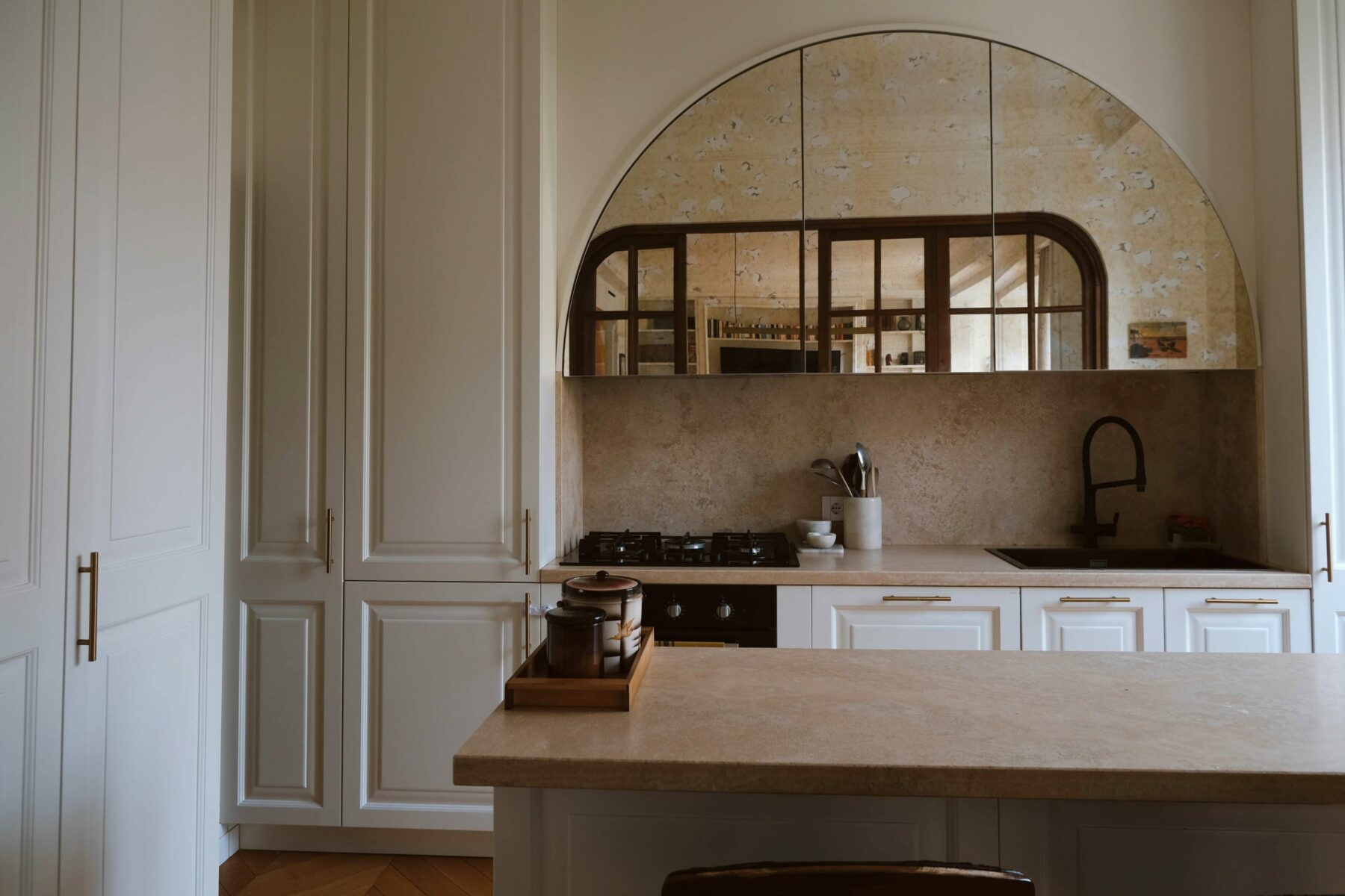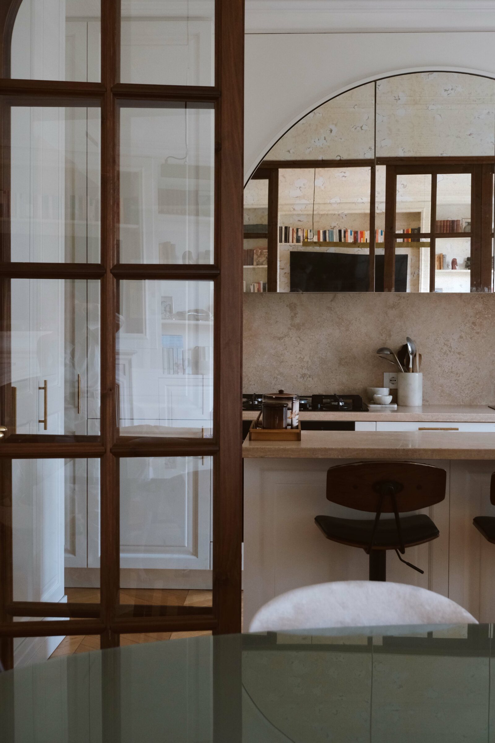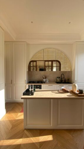 La parte living, ampia e luminosa, comprende un salotto con zona pranzo affacciato sul verde della via, valorizzato da grandi vetrate e da un pavimento in rovere di alta qualità. L’esposizione est/ovest garantisce una straordinaria luminosità naturale durante tutto l’arco della giornata. Una parete vetrata con porte scorrevoli collega il soggiorno alla cucina con isola centrale, completa di dispensa e lavanderia.