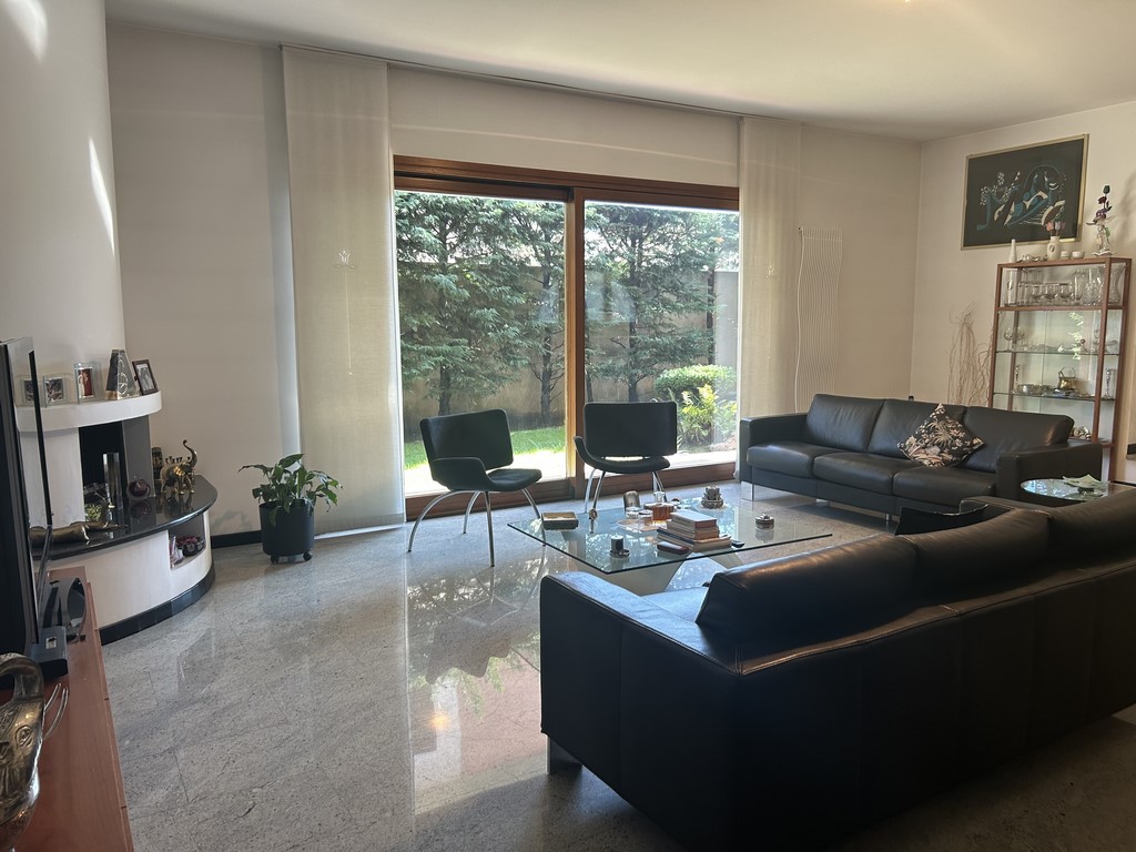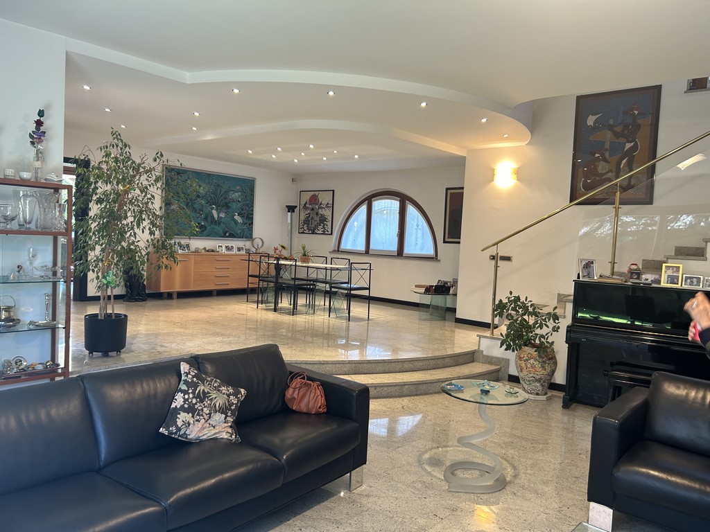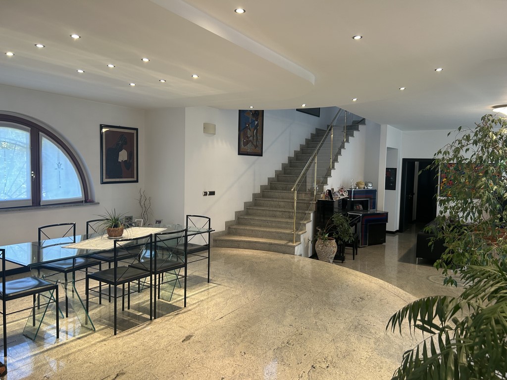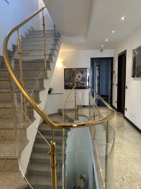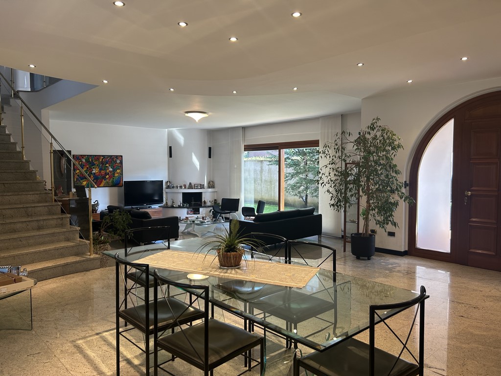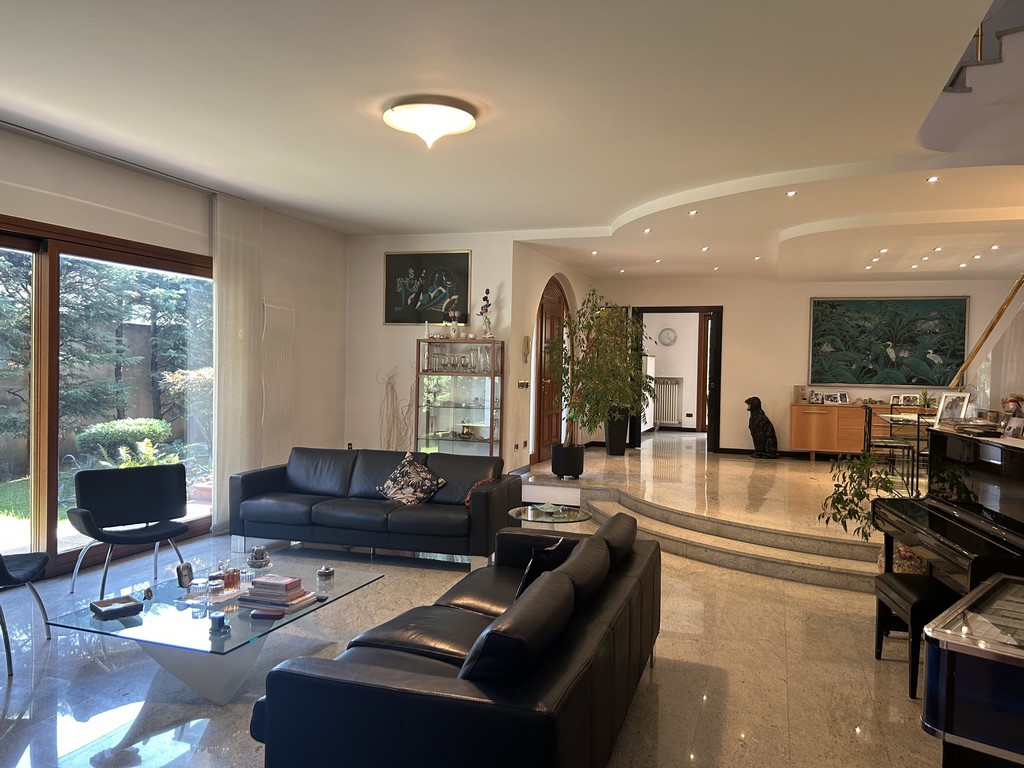 In zona tranquilla comoda ottimamente servita dalle principali vie di comunicazione, servizi e attività commerciali, nelle immediate vicinanze con 2 accessi di cui uno da via privata, bellissima villa su 4 livelli con giardino privato. Abitazione di 430 mq circa oltre giardino privato di 400 mq circa, disposta su 4 livelli collegati da bellissime scale interne in cristallo e ottone. Piano terra ampio soggiorno con camino e zona pranzo, cucina abitabile, studio (con possibilità d’ingresso indipendente), bagno ospiti completo di vasca e doccia. Primo piano con 3 camere da letto in parquet legno massello tutte con cabina armadio e bagni dedicati (suite padronale con vasca Jacuzzi) ognuna con accesso al proprio terrazzo. Secondo piano locale openspace (predisposizione ulteriore bagno) con doppia esposizione oltre a 2 terrazzi. Completa la proprietà il piano interrato composto da grande taverna con finestre, camino passante, zona lavanderia, camera di servizio, bagno, locale polifunzionale con porta blindata, acceso diretto all’autorimessa con capienza di 8/9 automobili. Finiture di livello quali pavimenti zona giorno in marmo Kashmir white, bagni realizzati in marmo rosa Portogallo, in marmo di Carrara e verde Guatemala, marmo Beole verde Vallespluga, porte interne Garofoli, impianto di aspirapolvere centralizzato . Riscaldamento e raffrescamento autonomi. Impianto antintrusione, porta blindata. La villa è stata progettata per una possibile suddivisione in due unità.